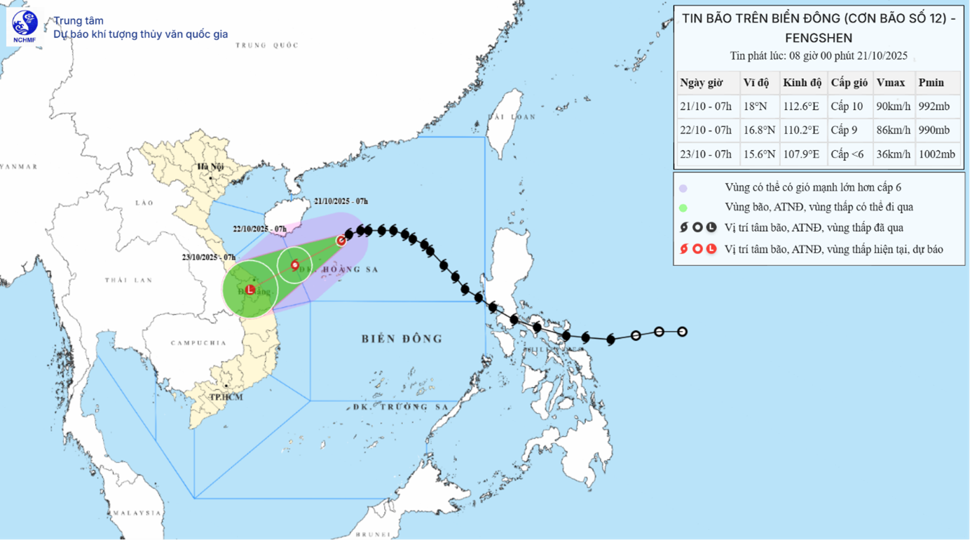 Bản đồ dự báo quỹ đạo và cường độ bão số 12 phát lúc 08h00 ngày 21/10/2025